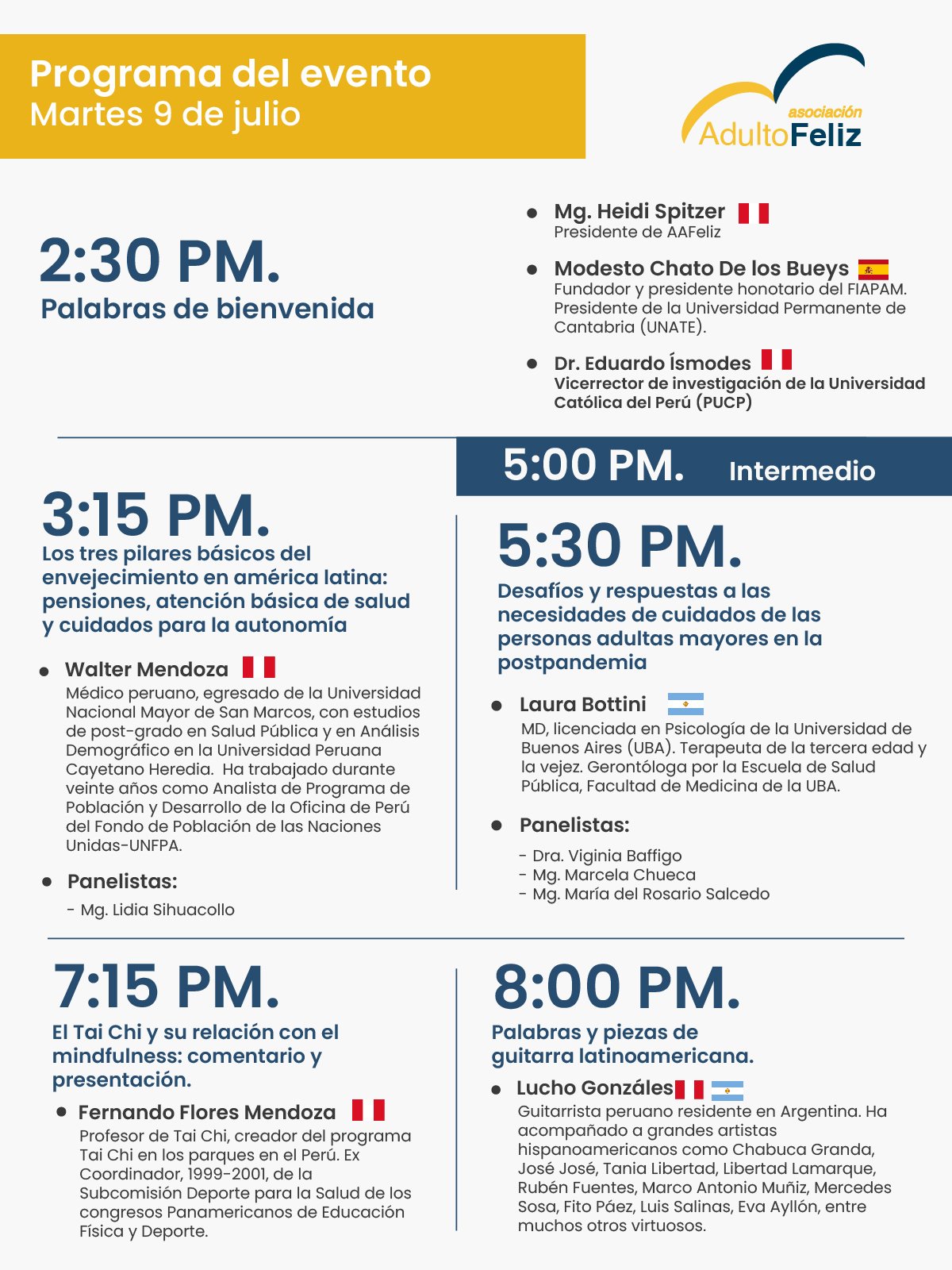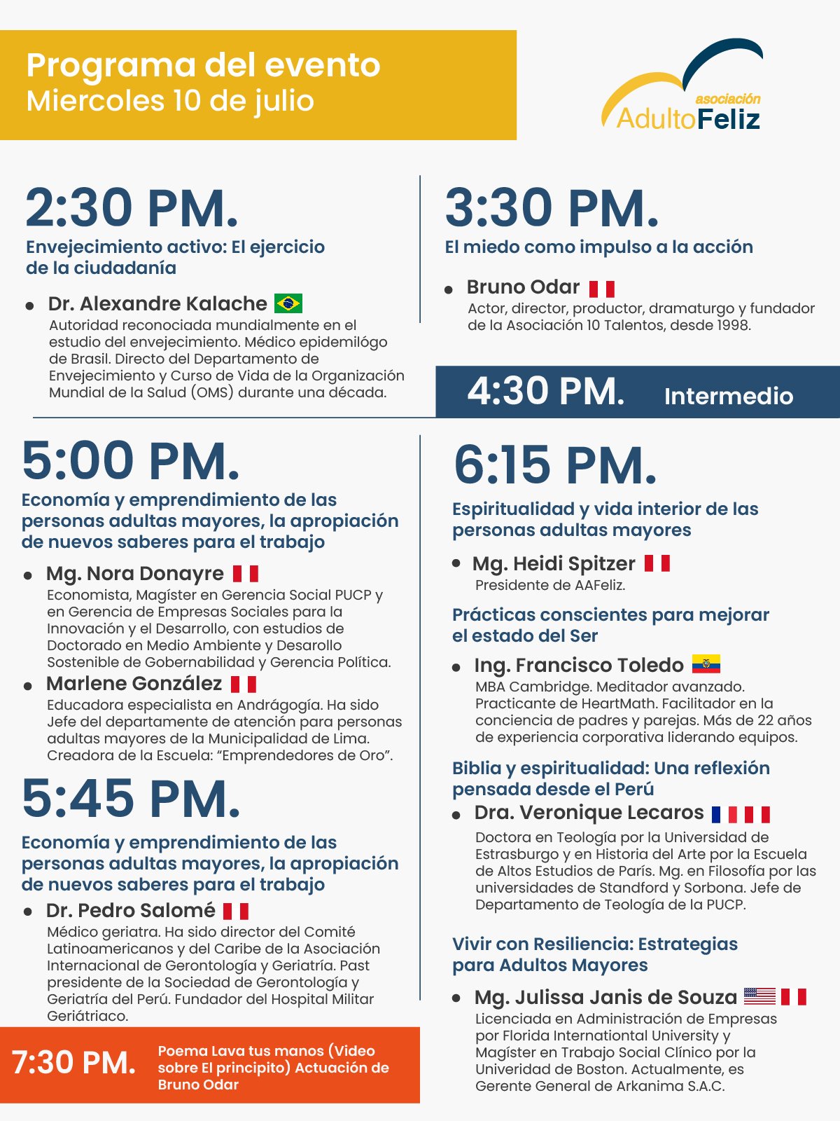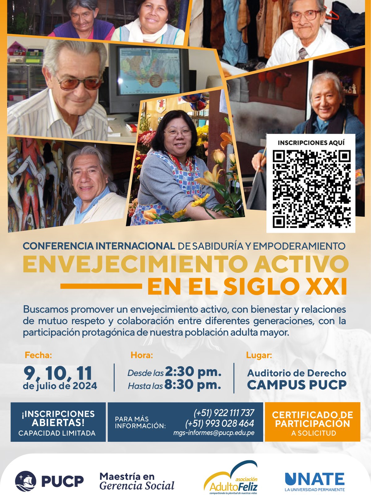 It is in this context that the Asociación Adulto Feliz, in collaboration with the Social Management Master’s Program at Pontificia Universidad Católica del Perú, is hosting this International Wisdom and Empowerment Meeting – Active Aging in the 21st Century. The goal is to share and discuss concepts, knowledge, experiences, and strategies that promote active aging, well-being, and mutual respect between generations, with the active involvement of older adults themselves.